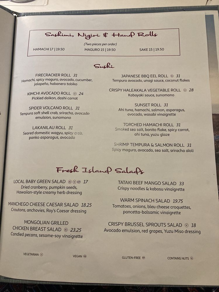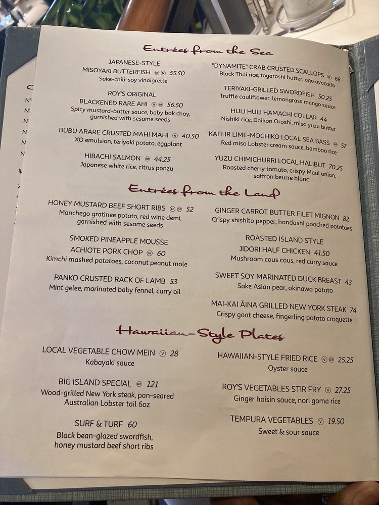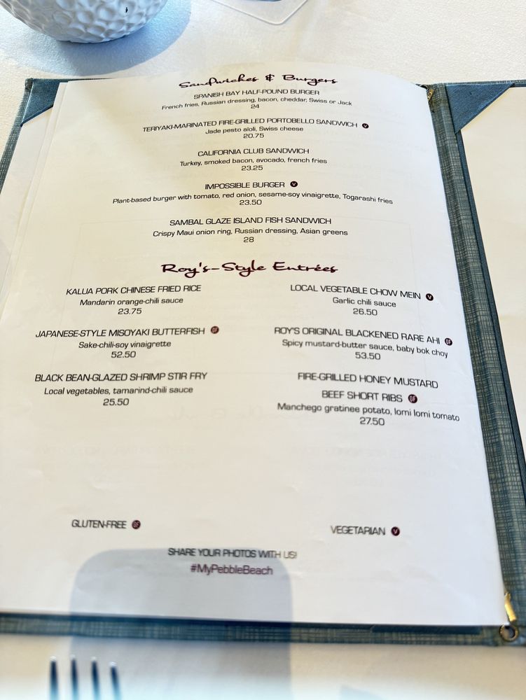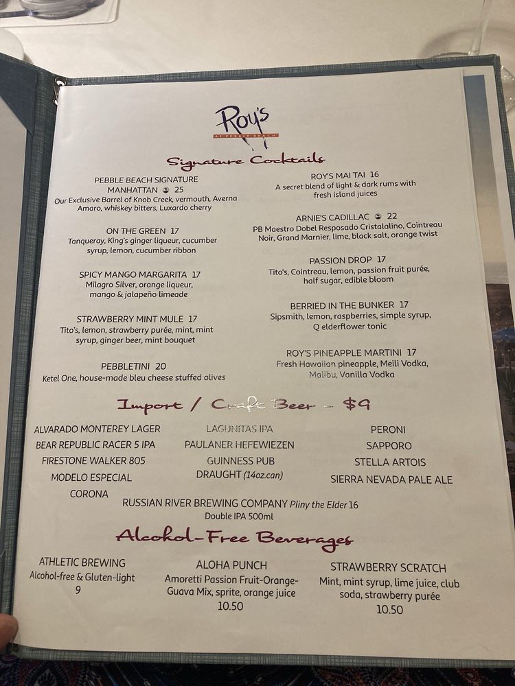 Introducing the menu at Roy’s at Pebble Beach, a stunning upscale restaurant with a romantic ambiance by the Spanish Bay Golf Course offering vegan and vegetarian options. The location boasts ocean views, outdoor seating, and a bagpiper serenading guests at sundown. Customers rave about the consistent meals, impeccable service, and delicious cocktails like the refreshing strawberry mint mule. The juicy burger with melted jack cheese, crispy bacon, and fresh toppings receives high praise, along with the shrimp tempura, salmon roll, and calamari. The bento box and beef noodle dish are highlighted as must-try items. With attentive servers and a packed yet bustling atmosphere, Roy's at Pebble Beach is the perfect choice for a special occasion or a scenic dining experience.